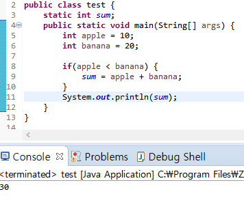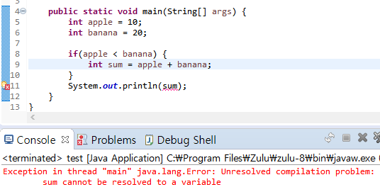- 아래와 같이 변수가 if문의 중괄호 내부에서 선언이 되었다면, 그 밖에서는 사용할 수가 없다. 만약 해당 중괄호 밖에서 접근 시 "cannot be resolved to a variable"이라는 에러가 발생한다.