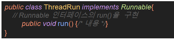 - Runnable 인터페이스를 구현하는 방법은 다음과 같고, 이 방법은 재사용성(reusability)이 높고 코드의 일관성(consistency)을 유지할 수 있기 때문에 보다 객체지향적인 방법으로 볼 수 있다.