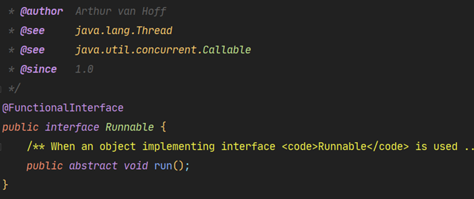- 또한, Runnable 인터페이스는 run()만 정의되어 있는 간단한 인터페이스이다.