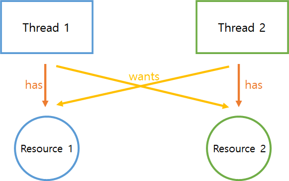 - Deadlock(교착상태)란 2개 이상의 쓰레드가 자원을 점유한 상태에서, 서로 상태편의 자원을 사용하려고 기다리느라 진행이 멈춰 있는 상태를 말한다.