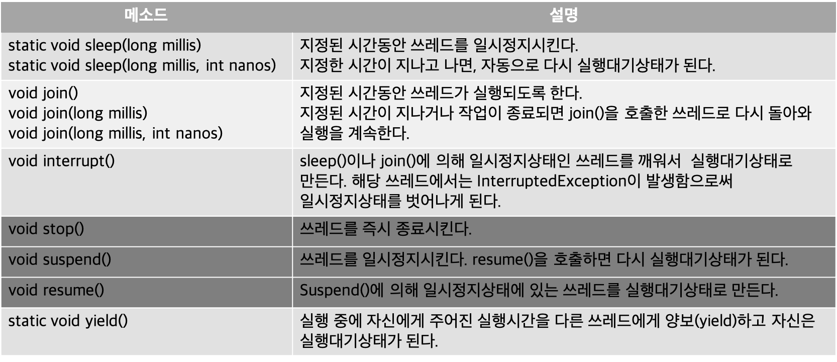 - 쓰레드의 스케쥴링과 관련된 메소드는 아래와 같다.