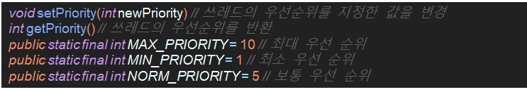 - 쓰레드의 우선순위와 관련된 상수와 메소드는 아래와 같다.