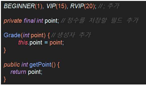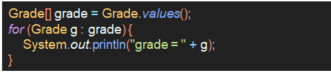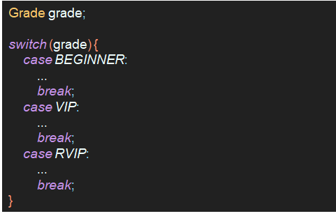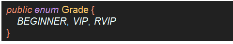 - 예를 들어, 3가지 Grade를 상수로 정의하는 enum Grade는 아래와 같다.