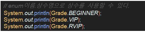 - 아래와 같이 'enum이름.상수명'으로 상수를 사용할 수 있다.