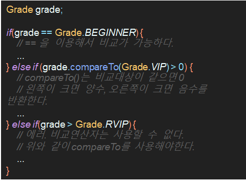 - 열거형 상수간의 비교에는 '=='를 사용할 수 있으며, '<, >'와 같은 비교연사자는 사용할 수 없고 compareTo()를 사용할 수 있다.