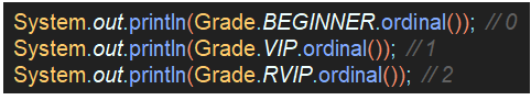 - enum의 ordinal()이라는 함수를 이용하면, enum 상수를 순서대로 반환한다. (왼쪽부터 0으로 시작)
