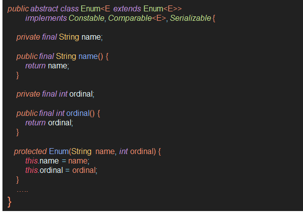 - 유일한 생성자인 protected Enum(String name, int ordinal)을 볼 수 있다.