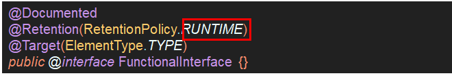 - @FunctionalInterface는 @Override처럼 컴파일러가 체크해주는 애노테이션이지만, 실행 시에도 사용되므르 유지 정책인 RUNTIME으로 되어 있다.