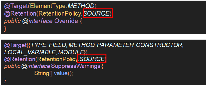 - 컴파일러가 사용하는 애노테이션(@Override, @SuppressWarnings)은 유지 정책이 SOURCE이다. 컴파일러를 직접 작성할 것이 아니라면 이 유지정책은 필요없다.