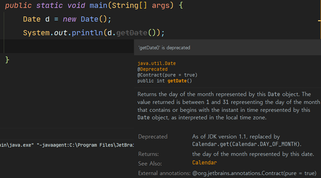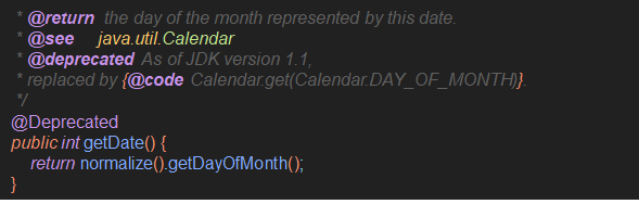 - 예를 들어 java.util.Date 클래스의 대부분의 메소드에는 @Deprecated가 붙어있다. 그 중에서 getDate()를 보면 아래와 같이 Calendar클래스의 get()을 사용하라고 적혀 있고, Date클래스의 getDate()메소드에는 @Deprecated가 붙어 있는 것을 볼 수 있다.