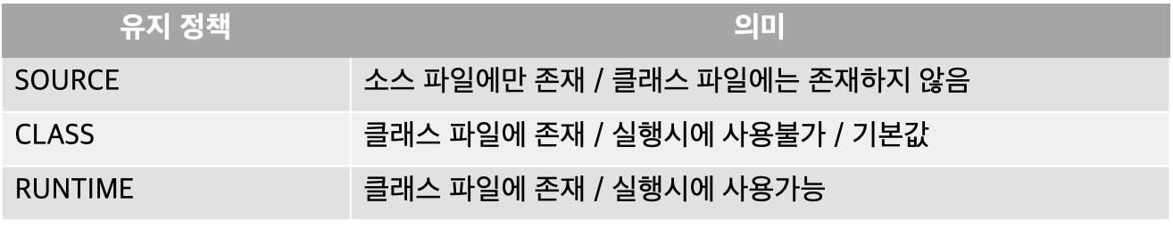 - 애노테이션인 유지(retention)되는 기간을 지정하는데 사용된다.