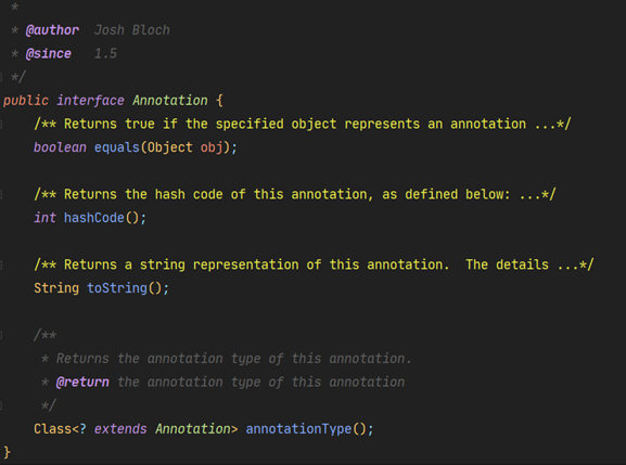 - 아래와 같이 모든 애노테이션의 조상인 Annotation은 애노테이션이 아니라 인터페이스로 정의가 되어 있다. 따라서, 모든 애노테이션 객체에 대해 equals(), toString()과 같은 객체 호출이 가능하다.