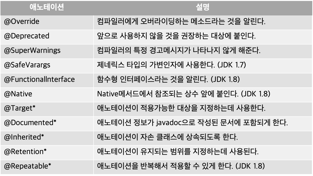 - 자바에서 기본적으로 제공하는 표준 애노테이션과 애노테이션을 정의하는데 사용되는 '애노테이션의 애노테이션'인 메타 애노테이션이 있다.