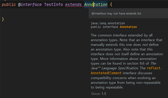 - 그리고 모든 애노테이션의 조상은 Annotation (java.lang.annotation.Annotation) 이다. 하지만, 애노테이션은 상속이 허용되지 않으므로 아래와 같이 extends 할 수는 없다.