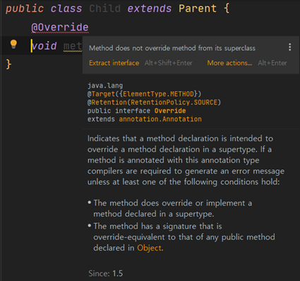 - 예를 들어, 아래와 같이 오버라이딩을 할 때 메소드의 이름을 잘못 적는 경우가 있다고 가정해보자. 컴파일러는 잘못 적은 메소드를 오버라이딩 하는 메소드로 인식하는 것이 아니라, 새로운 메소드가 추가 되었다고 인식한다.
