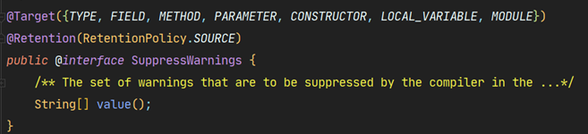 애노테이션 적용대상 종류 - 아래와 같이 @SuppressWarnings 정의를 보면, 이 애노테이션에 적용할 수 있는 대상을 @Target으로 지정한 것을 볼 수 있다.여러개의 값을 지정할 때는 괄호 { }를 사용한다.