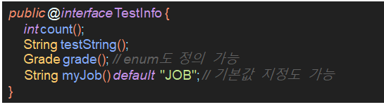 - 그리고 아래와 같이 요소들을 정의할 수 있으며, 애노테이션의 요소는 반환값이 있고 매개변수는 없는 추상 메소드의 형태를 가지며, 상속을 통해 구현하지 않아도 된다.