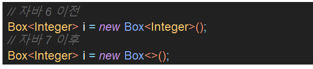 - 즉, 자바 컴파일러가 타입 파라미터 부분에 < > 연산자를 사용하면 알아서 유추해서 자동으로 생성해준다.