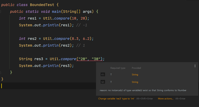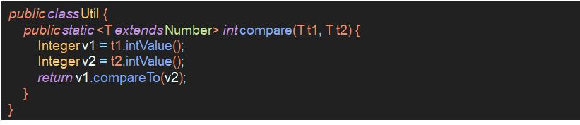 - 예를 들어, Util클래스에서 Number만 구체적인 타입으로 갖는 제네릭 메소드 compare()를 만들었다. 두 개의 숫자 타입을 매가값으로 받아 compare 한 결과 값을 return한다.