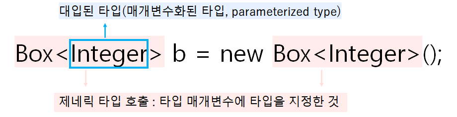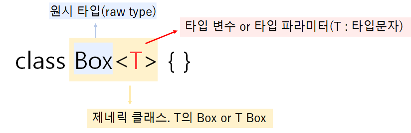 - 아래와 같이 제네릭 클래스 Box가 선언되어 있다면, 각 부분을 부르는 용어는 아래와 같다.