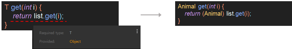 - 와일드 카드가 포함되어 있는 경우 또한 적절한 타입으로의 형변환이 추가된다.