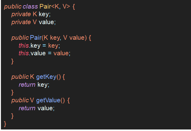 - 제네릭 타입은 앞서 본 것 처럼 하나의 타입 파라미터 뿐만 아니라, 두 개 이상의 멀티 타입 파라미터를 사용할 수 있다. 이 경우 각각의 타입 파라미터는 콤마( , )로 구분한다.