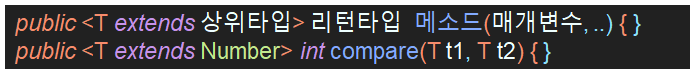 - 제한된 타입 파라미터를 선언하려면 타입 파라미터 뒤에 extends 키워드를 붙이고 상위타입을 적으면 된다.