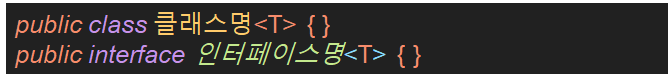 - 그래서 제네릭 타입은 클래스 또는 인터페이스 이름 뒤에 < > 부호를 붙이고, < > 사이에 타입 파라미터(ex. T)를 넣는다.