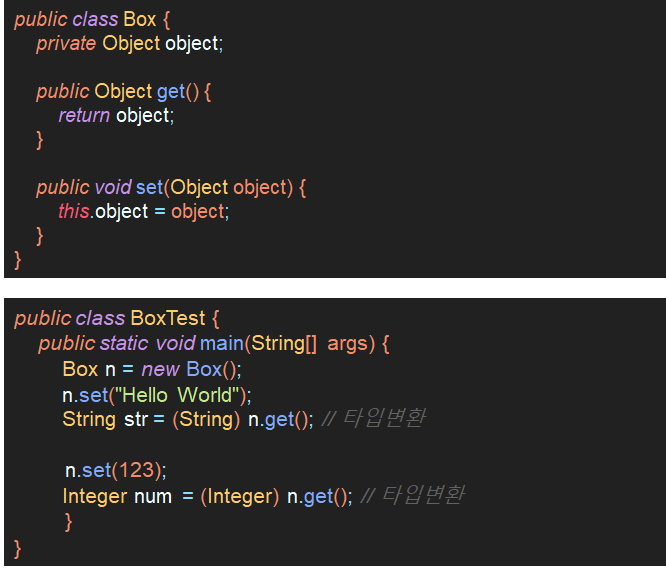 - 예를 들어, 비제네릭으로 Box 클래스를 만들어보면 아래와 같을 것이다. 이렇게 되면 모든 종류의 객체(Object 타입으로 선언하였으므로)를 저장할 수는 있겠지만, 타입 변환이 발생하게 된다.