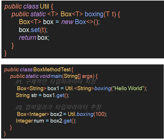 - Util 클래스에서 boxing이라는 제네릭 메소드를 정의하고, BoxMethodTest 클래스에서 호출하였다.