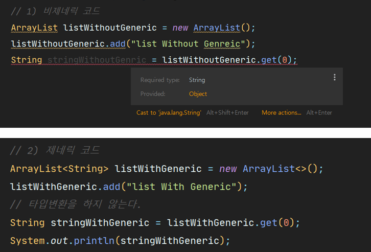 - 타입 변환(type casting)을 제거한다. 예를 들어 ArrayList와 같은 컬렉션 클래스를 사용했을 때, 비제네릭 코드는 불필요한 타입 변환을 진행하여 프로그램 성능에 악영향을 미친다. 하지만, 제네릭 코드를 사용하면 이러한 타입변환을 할 필요가 없어서 프로그램 성능이 향상되고 코드가 간결해진다.