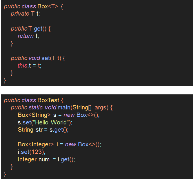 - 즉, 클래스를 설계할 때는 구체적인 타입 대신 타입 파라미터를 사용했다. 그렇게 되면 실제 클래스를 사용될 때 구체적인 타입을 지정하게 되고, 타입 변환을 최소화시킬 수 있다.