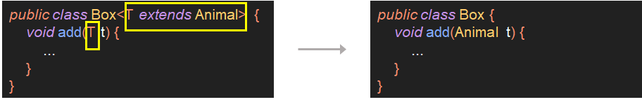 - 예를 들어, 제네릭 타입이 <T extends Animal> 이라면 T는 Animal로 치환된다.