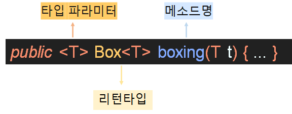 - 선언하는 방법은 리턴 타입 앞에 < > 기호를 추가하고 타입 파라미터를 넣은다음, 리턴 타입과 매개 타입으로 타입 파라미터를 사용하면 된다.