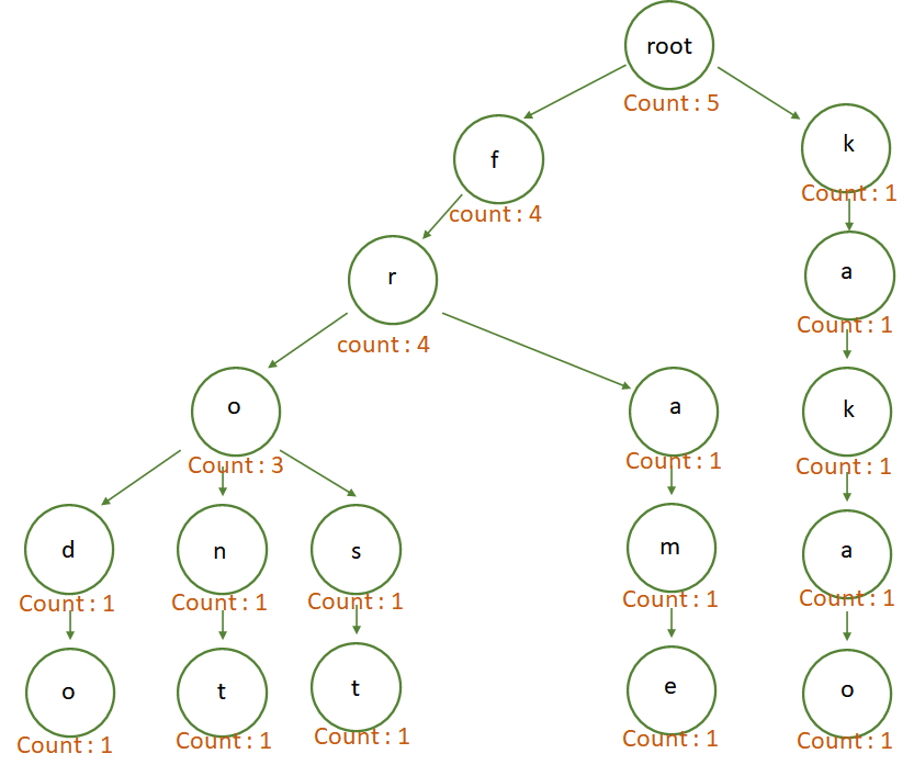그리고 트라이를 구성했을 때 아래와 같이 구성할 수 있을 것이다. 이 때 만약 queries 중에 "fro??"라는 값이 들어왔다고 해본다. 이 때, 기존 방식처럼 count를 한다면, o의 count는 같은 depth 4개를 가지고 있어서 "fro??"에 해당하는 답은 4가 될 것이다. 하지만 이것은 세면 안되는 frozen까지 센 방식으로, 정답과 틀리다.