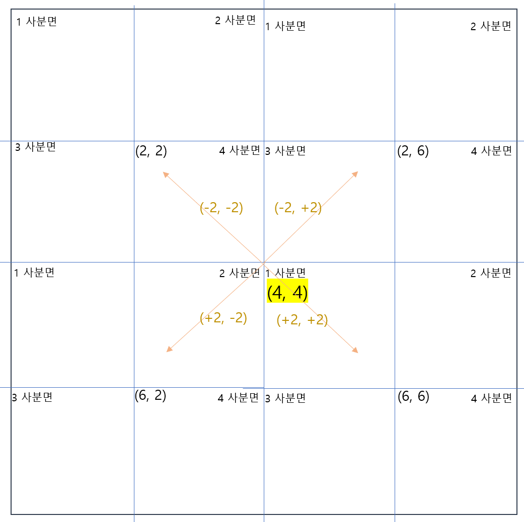 또한, 각 사분면이 움직일 때마다 더해야하는 수가 있다.