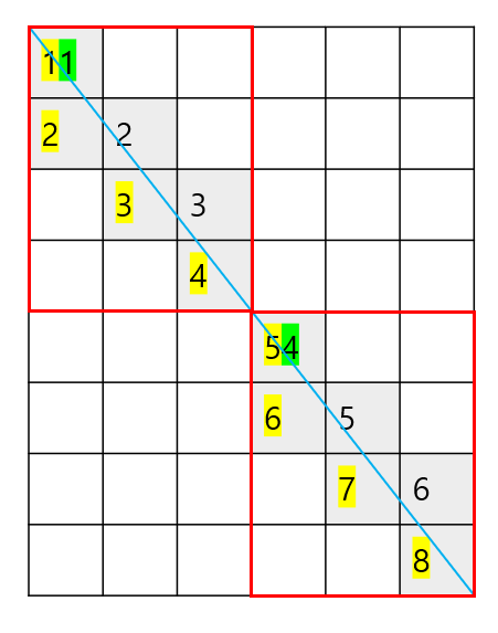 우리는 사각형을 가로지르는 선을 그으면서 패턴을 발견할 수 있다. 그리고 이 패턴의 갯수를 셀 때 세로로 그리고 가로로 셀 수가 있는데, 이 때 겹치는 부분이 존재한다.