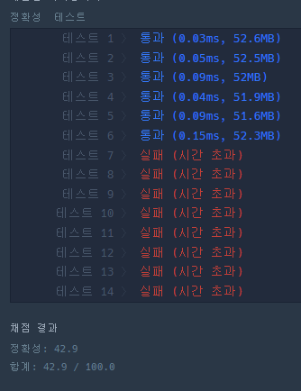 123456789101112class Solution {public int solve(int n) {if(n == 0) return 0;else if(n == 1) return 1;else if(n == 2) return 1;return ((solve(n-1) % 1234567) + (solve(n-2) % 1234567)) % 1234567;}public int solution(int n) {return solve(n);}}cs O(2^N)으로 7번 테스트부터 시간초과가 난다.