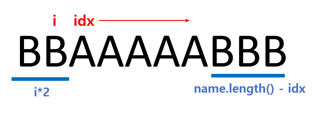 그렇게 하면 오른쪽으로 갔다가 다시 왼쪽으로 가는 경우를 i*2 + name.length()-idx로 구할 수 있다.