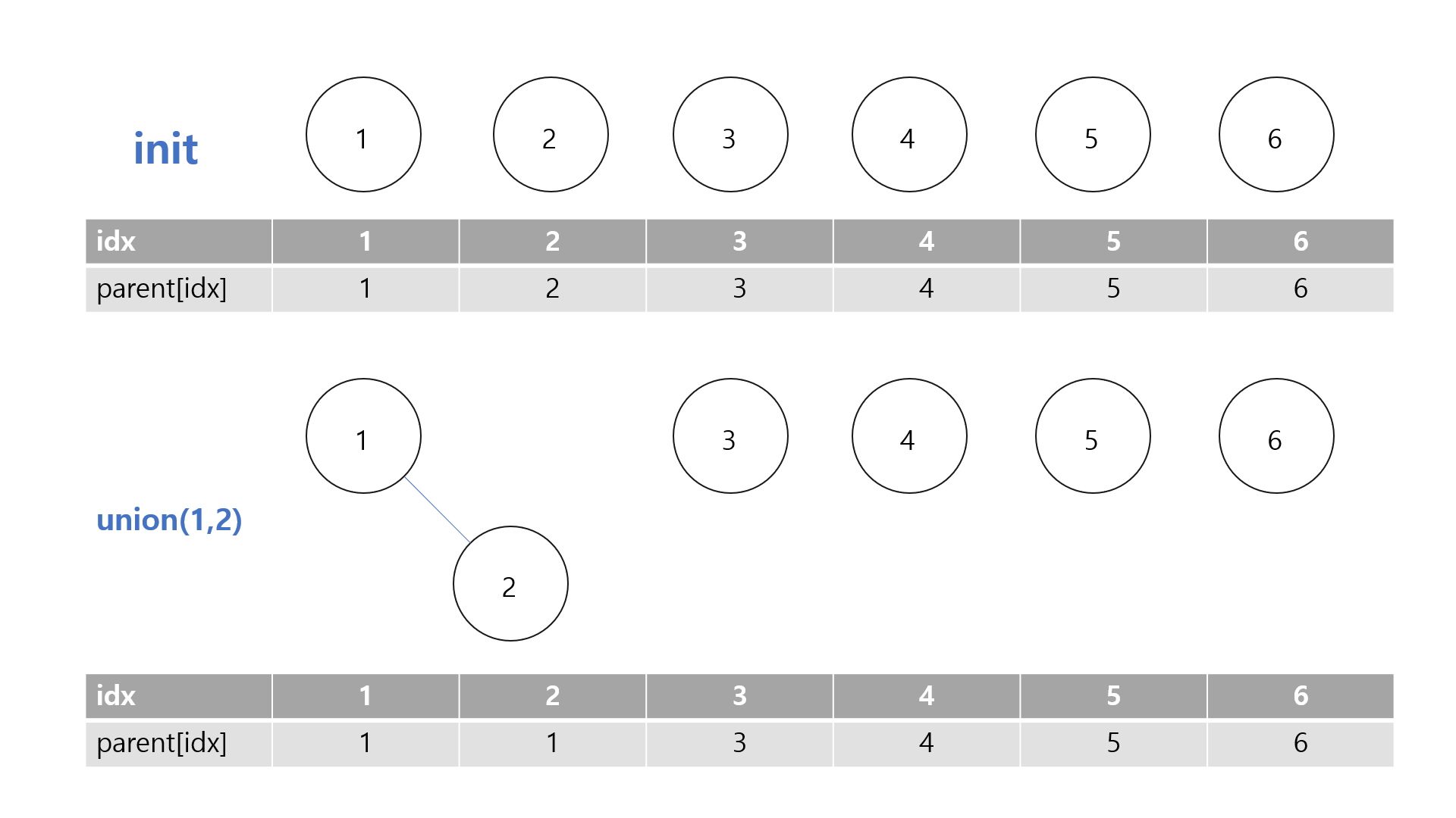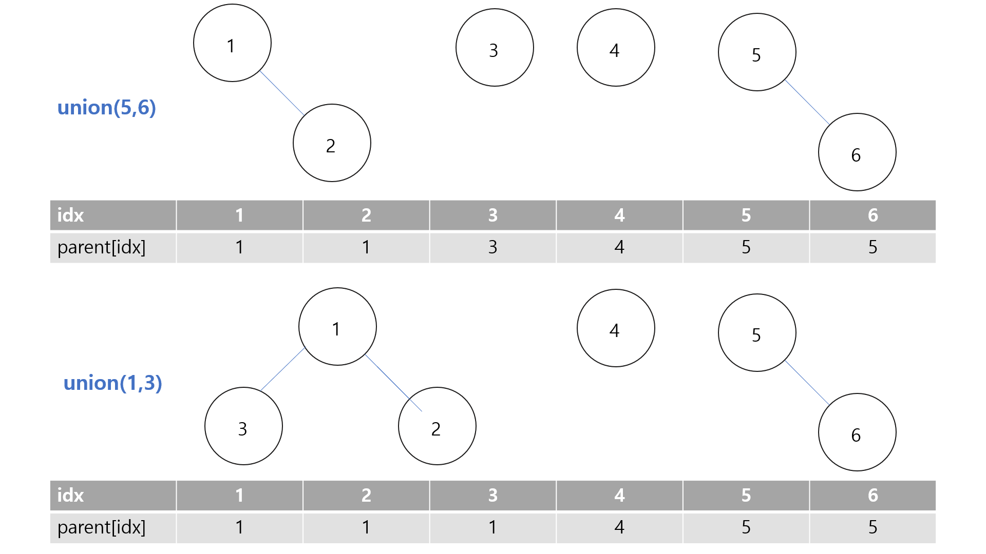 1234567void union(int x, int y) { // y > xx = find(x);y = find(y);// 부모가 다른 경우if(x != y) parent[y] = x;}cs