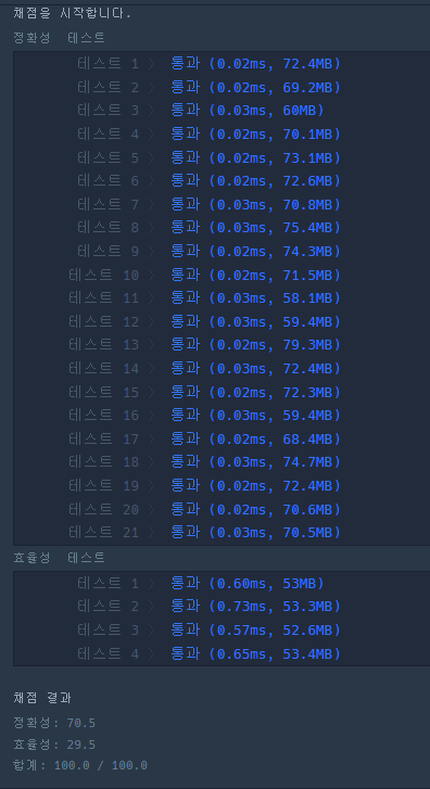 답은 맞는데 계속 틀렸던 부분은 Math.ceil()을 사용해서 효율성에서 시간초과가 났었다.. 직접 계산해주는 것으로 바꾸니 통과되었다.