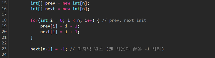2) 그리고 원소들의 index를 따로 관리할 수 있게 prev배열과 next배열을 만든다. 초기값 세팅 시, 맨 앞 노드의 prev는 -1이 되고 맨 뒤 노드의 next는 -1로 처리한다.