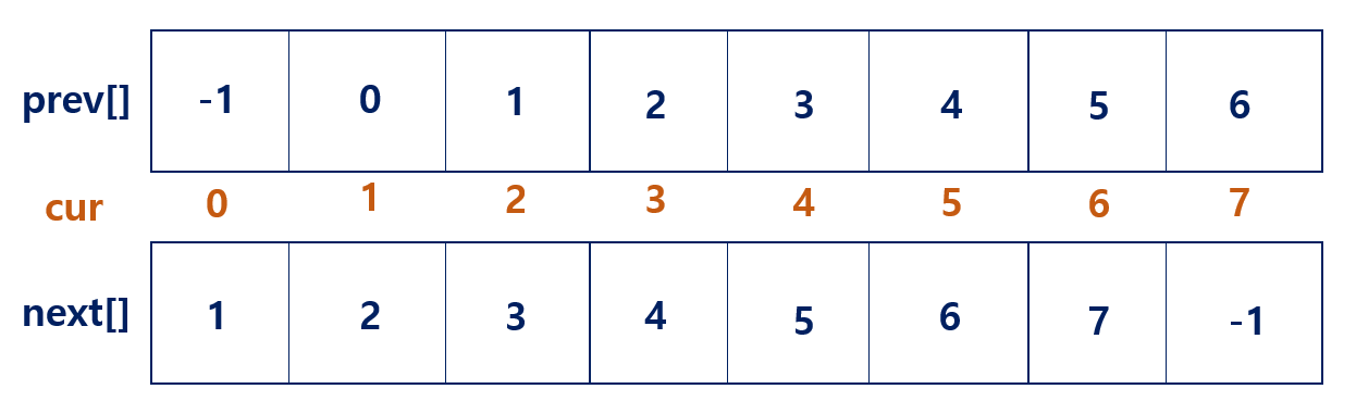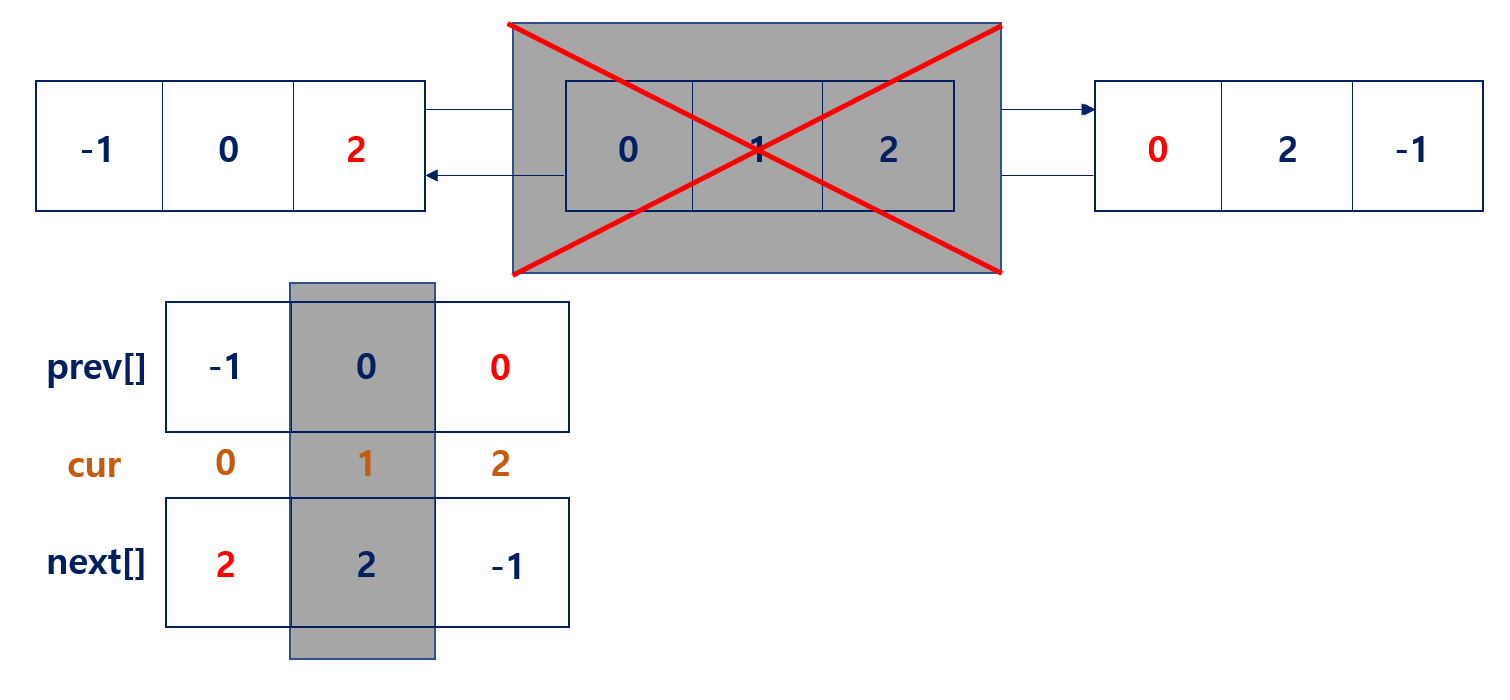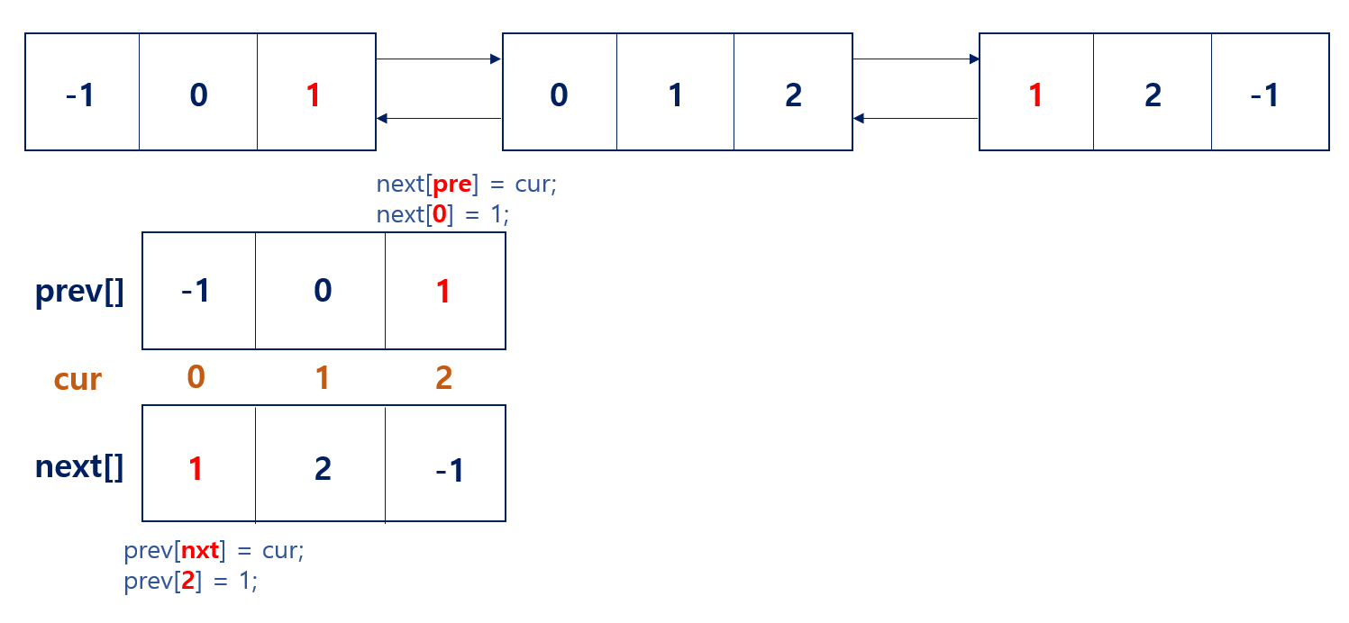 2) 그리고 원소들의 index를 따로 관리할 수 있게 prev배열과 next배열을 만든다. 초기값 세팅 시, 맨 앞 노드의 prev는 -1이 되고 맨 뒤 노드의 next는 -1로 처리한다.