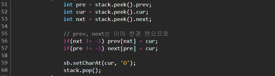 stack에서 pop을 해서 삭제 되었던 prev, cur, next를 꺼낼 수 있다. 그래서 가장 처음 노드, 가장 마지막 노드인 경우를 체크하면서 prev배열과 next배열을 복구하면 된다. 그리고 StringBuilder에서 해당 위치 삭제처리했던 것을 복구시킨다.