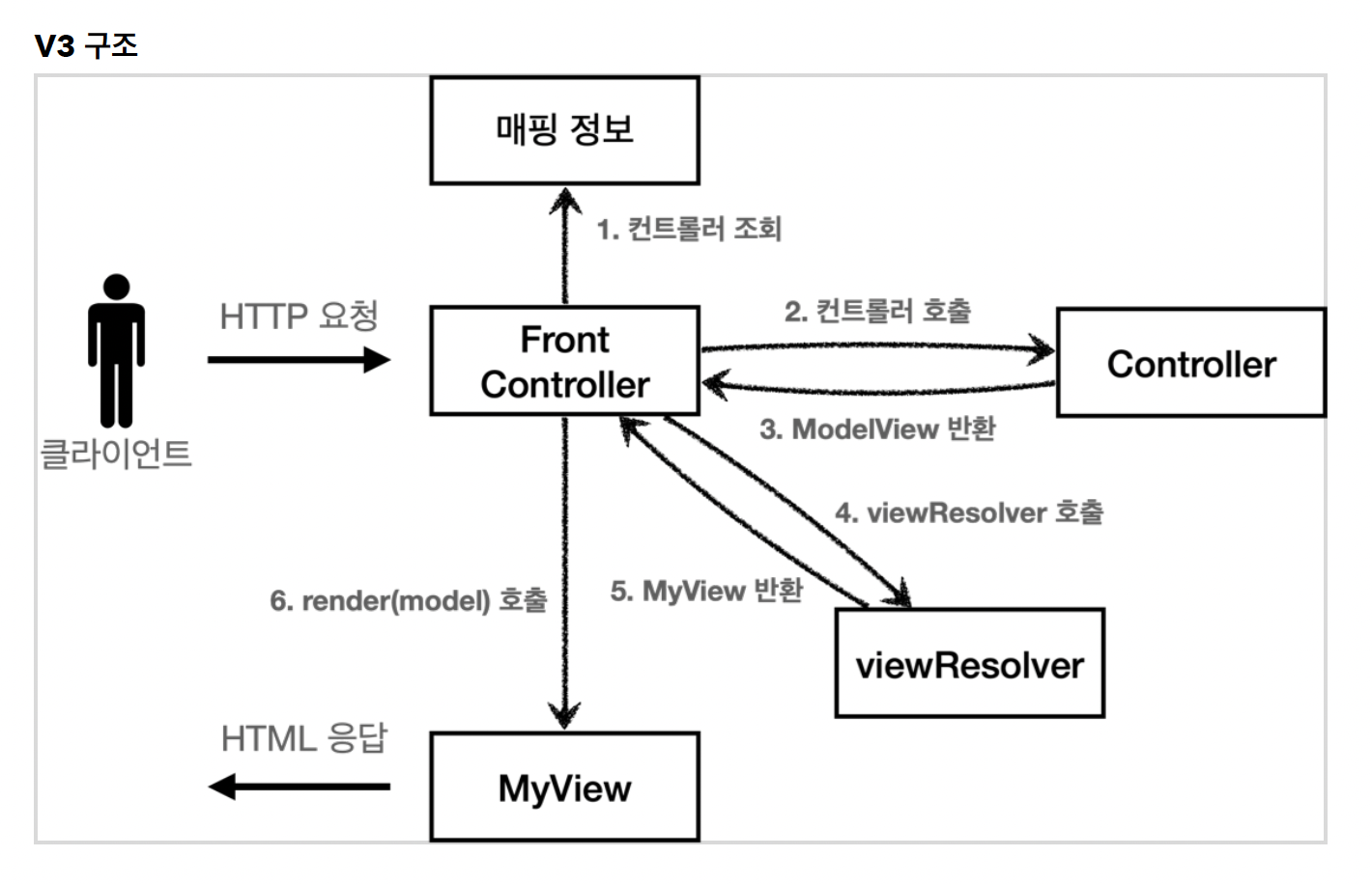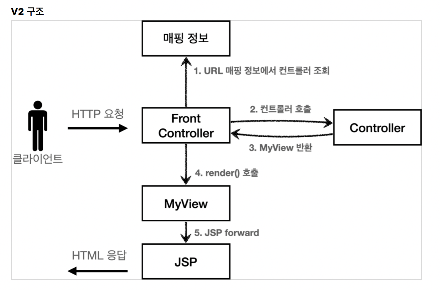 - 앞서 ControllerV2의 반환 타입이 MyView이므로, 프론트 컨트롤러도 해당 타입으로 받음