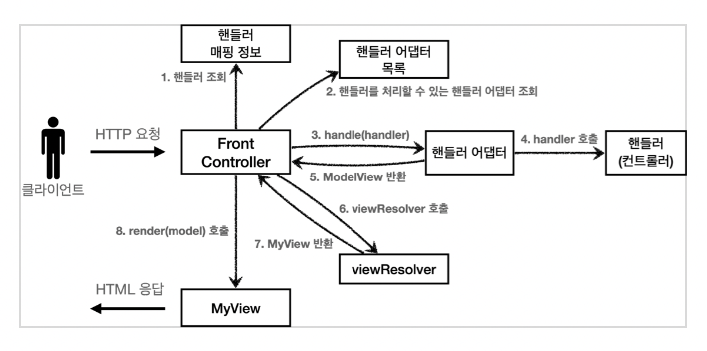 - 이전에는 프론트 컨트롤러가 실제 컨트롤러를 호출했다면, 이제는 어댑터를 통해 컨트롤러를 호출