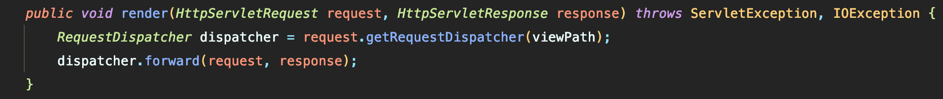- view.render()를 호출하면 forward 로직을 수행해서 JSP가 실행됨