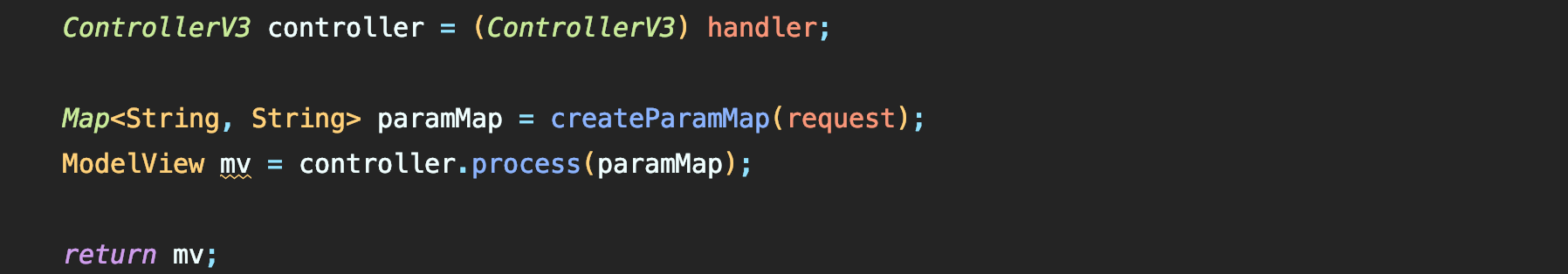 - handler를 컨트롤러 V3로 변환하고 호출 (V3는 ModelView 반환하므로 똑같이)