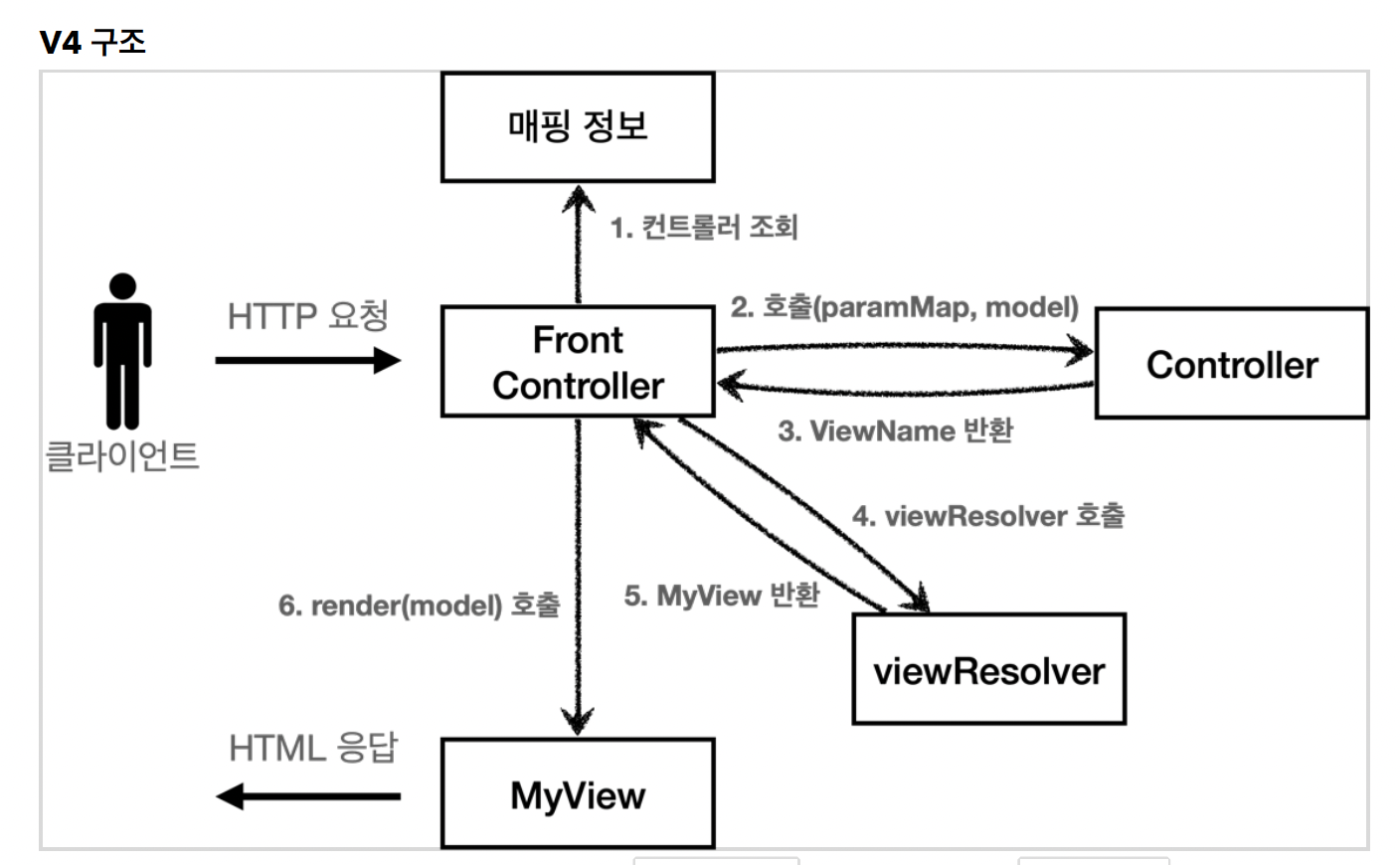 - 기존 구조는V3와 같고, 대신 컨트롤러가 ModelView를 반환하지 않고 ViewName만 반환 (3)