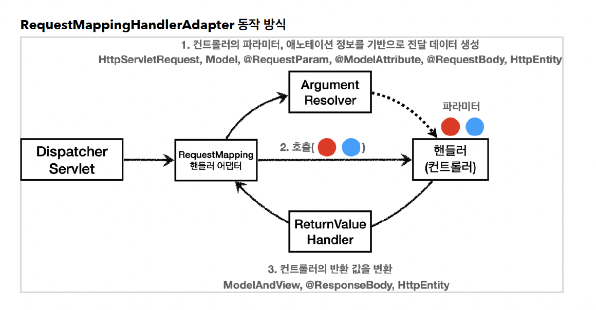 - 즉, 애노테이션 기반 컨트롤러를 처리하는 RequestMappingHandlerAdapter는 ArgumentResolver를 호출해서 컨트롤러(핸들러)가 필요로 하는 다양한 파라미터의 값(객체)를 생성